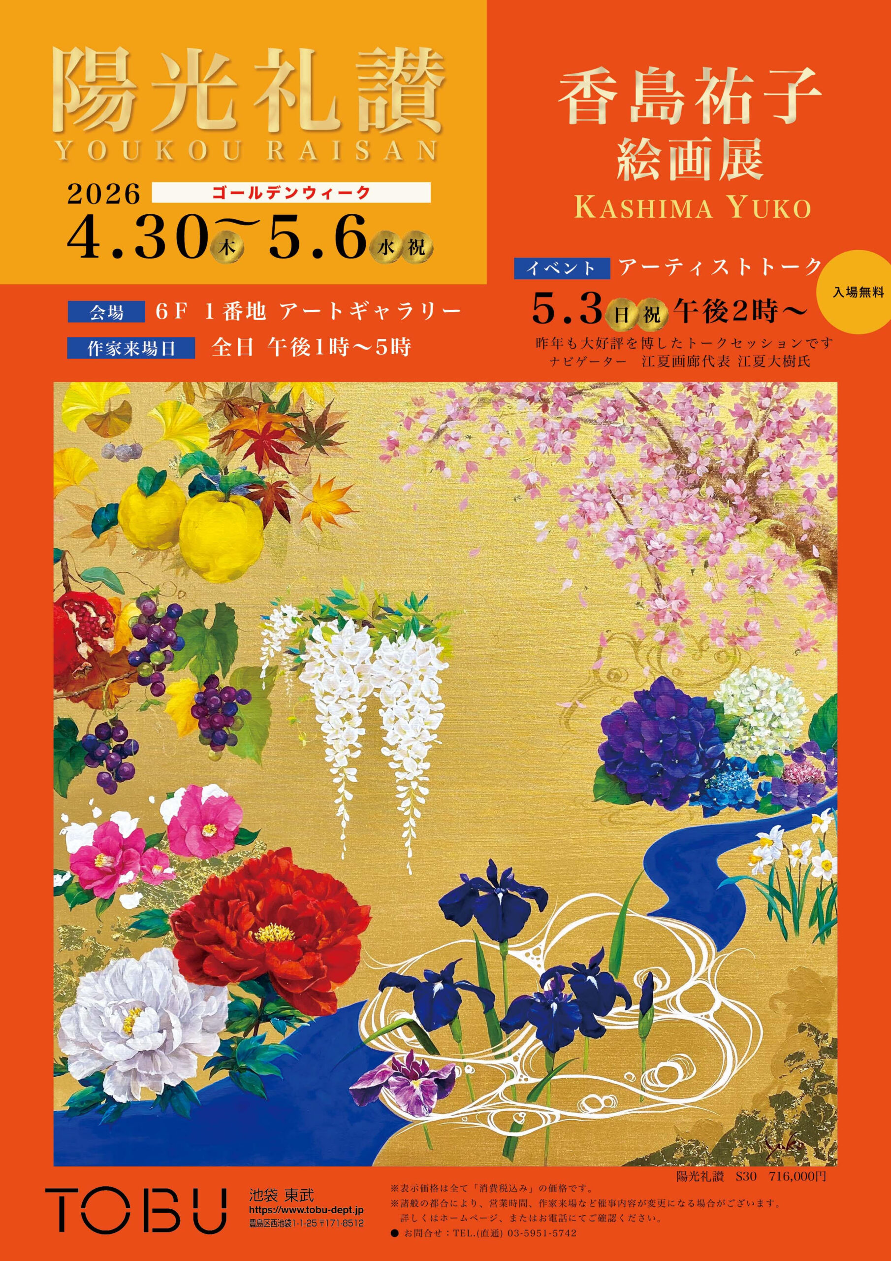 | 解説 | 東武百貨店 池袋店では2回目の香島祐子絵画展となります。鮮やかな色彩と絢爛豪華な作品で、前回とても好評だった個展がふたたび!5月3日(日祝)14時からは、江夏とともに、約30分程度アーティストトークをさせていただきます。元気をもらえる香島先生の作品をぜひご高覧ください。 |